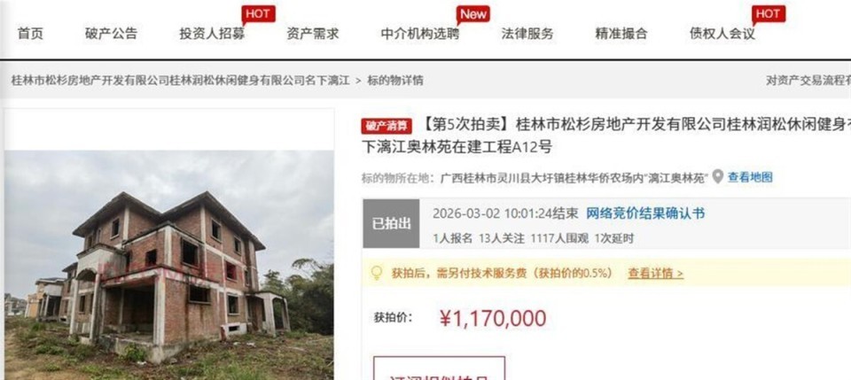 在深圳,117万只能买不到2平方米的住宅面积。在桂林,同样的钱却能拿下962平方米的独栋别墅,还附带865.9平方米的私家花园。这是2026年3月2日京东拍卖平台上发生的真实交易。漓江奥林苑小区A12号别墅,建筑面积相当于十个标准篮球场,最终以底价117万元成交,折合每平方米仅1216元。